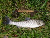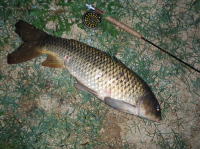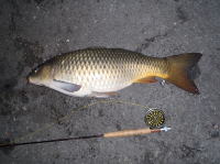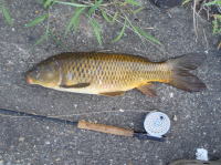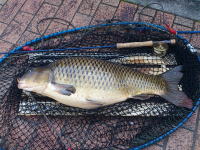 実家の近所の水路で水底の砂をふかしているコイを発見。 イトトンボのヤゴをイミテートしたフライでなんとかキャッチする事が出来ました。 |