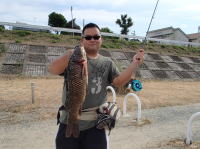 コイを釣ろうと思ってたのに釣れたのは、この平たい魚1匹。 小林さんに聞いた所、やはりテラピアだと言う事でした。 |