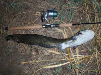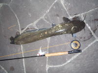 近所の川でナマズがよく釣れているのを職場のおばさんから聞きました。 そこで、日が暮れるのを待ってフライで狙ってみたのですが、なかなか針に掛からず、苦戦しました。 |