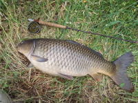 会社の近くの水路を偵察してきました。 水底の泥を吸い込みながら捕食しているコイを見つけました。 口元にフライを送り込み、ごまかしながらようやく食わせました。 |