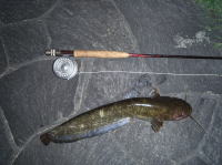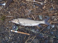 仕事の帰りにフライロッドを持って、河口をリサーチしてきました。 水底に数匹のニゴイが群れていて、口元にフライを流し込んだところ、やっと食わせる事が出来ました。 |