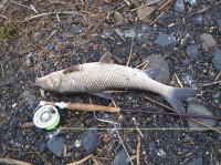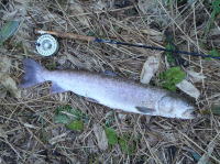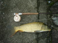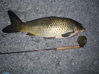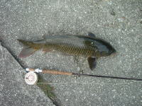 サツキマス狙いに行ったのですが、時期が早かったせいか、ウグイとナマズしか釣れませんでした。 午後から水路でコイを発見。パンを撒いて、何とかバイトに持ち込みました。一時はバッキングラインまで出されました。 |