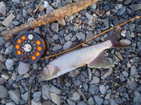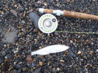 今年の北海道遠征は天候には恵まれたものの、トンギョ(トゲウオ)の遡上にうまく合わず、初日にエンリコミノーに食わせた、このイトウ1本のみに終わりました。 川の河口付近でボイルするイトウを見つけるも、かなり食わせずらいものがありました。 |