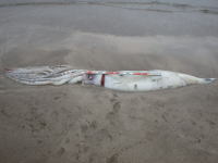 今日、朝から親父さんから電話で浜に大きなイカが流れ着いているとのこと。もしやと思い浜に出てみるとやっぱりあいつでした。触腕がなくなっていましたが全長約3,5mのダイオオイカでした。 触腕があれば7~8mはあったと思われます。すぐに山陰科学館に連絡して、県の博物館の研究員の方が来ておられました。これでも鮮度がいいようで臭くもなく触ってみたら硬くてソデイカのような感じでした。 |