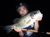 雨の後、オオナマズを狙うべく、湖北のワンドにウェーディングしてきました。 夜中中、フルキャストするも、オオナマズのヒットはなく、釣れたのは、このグッドコンディションのバス1匹のみ。 |