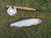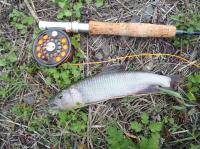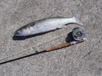出張で徳島に行った帰りに橋の上から見るとエサを捕食しているニゴイを発見。 車からフライロッドを取り出し、流れに乗せてストリーマーを近づけた所、3匹のうちの1匹がヒット。 |