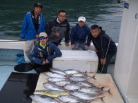 | 2015年8月25日 和歌山県海南沖 ハマチ 2kg~3kg 15本 ガシラ 25cm 1本 エソ 40cm位 3本 ジギングロッド PE2号 ジグ 100~150g |