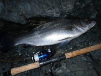 前日からの北東風が強く、東側の磯は波が高すぎて入れませんでした。 夕方になってから、波の影響の少ない西側のポイントへ。 ツーバイトで大橋氏の釣ったヒラスズキのみでした。 |