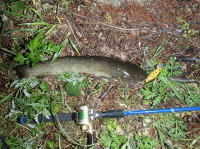 事務所の近所の川でナマズが釣れるという情報を聞いたので、さっそくルアーをもって出かけてきました。 水はかなり濁っていましたが、何とか1匹釣ることが出来ました。 迷彩色のある個体でした。 |