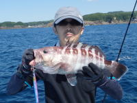 潮岬釣行の3日目の早朝に東側で小型のヒラスズキをなんとか1本ゲット。 その日の夕方は、クラブメイトの大橋君の案内で磯のヒラスズキを狙いに行きました。 しかし波の向きが悪く、ヒラスズキはノーバイト。 大橋君はジグヘッド+ソフトルアーで何と、アカマツカサをGET! |