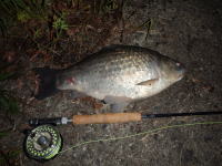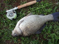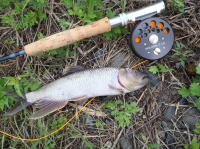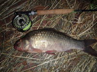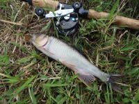 会社の帰り、実家の近くの水路でニゴイとフナを発見。 白っぽい色のニンフを口元にキャストして、なんとか1匹釣れました。 |