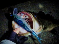 大潮周りでバスは産卵モードに入りそこそこサイズがうろつくもルアーには反応せず。プリのしっかり餌を食う個体を 探してブッシュが絡む護岸のえぐれにルアーをスライドさせると下から突き上げるように食いました。同パターンでもう一本かけるも外がかりでフックアウト。この日 は狙い通りに食わせられたので満足でした。 |