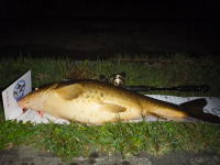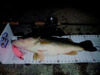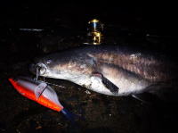 先日98cmを釣ったのと全く同じパターンでヒット。ウエイトの凄い個体で何度もドラグを出しかなり引きました。 釣り人の気配が消えた夜中に岸際に小鮎を食いに来ているようです。 |