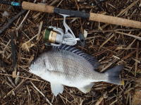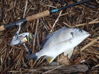 1時間ほどキャストすると啄むような小さなアタリ。送り込んで持って行ったところをしっかり合わせて なんとかキャッチ。2月も後半ですが、まだまだ冬の釣れ方でした。 |