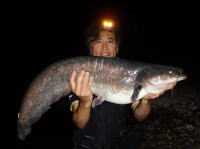 大雨の後、ビワコオオナマズを釣りに行ってきました。 気圧の下がる夜半過ぎにヒット。 あまり大きいサイズではありませんが、今年も琵琶湖の主に出会う事が出来ました。 それにしても、ここ近年ビワコオオナマズも全体的に小型化しているように思えてなりません。 原因はよくわかりませんが、21年前に私が釣ったビワコオオナマズのオールタックル世界記録が未だに抜かれていません。 ビワコオオナマズだけではなく、スズキやヒラスズキも一昔前に比べれば小型化しているような気がしています。 |
