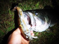 マグナムバドで菱藻の際を鳴らしていると激しく出ました。最近の琵琶湖はブルーギルも相当減っているので 餌を食えていないようなガリガリの個体が目立ちます。 |