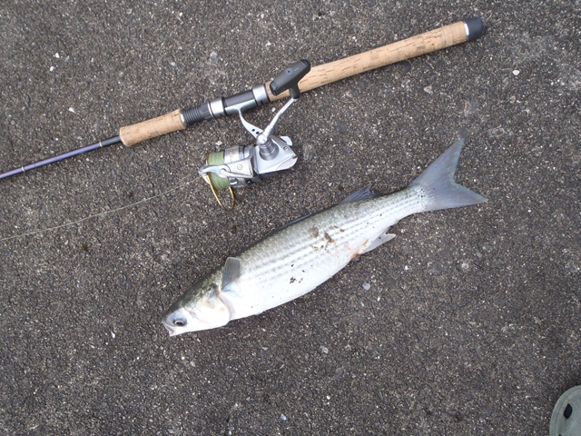 出張の帰り、休憩がてらに立ち寄った岸壁で、ボラの群れを見つけ、人工のエサでなんとか釣る事が出来ました。