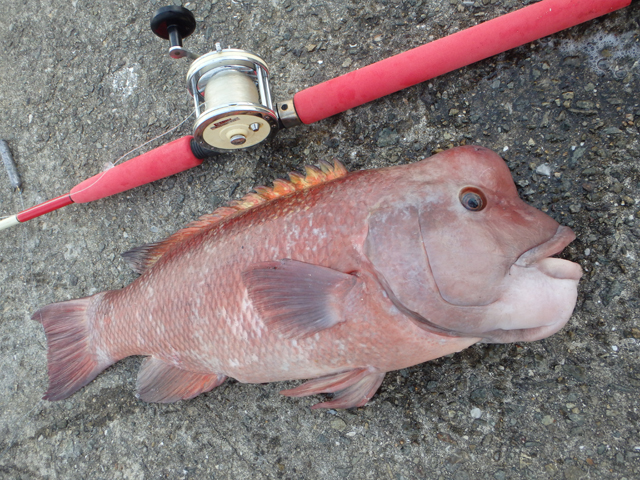 今シーズン初めてのコブダイ釣りに行ってきました。 数年前からオフショアの釣りで流行っている(ヒトツテンヤ)を使って岸壁の下を狙いました。 まだ水温が高いのかエサ取りが多く、そこで集魚剤入りソフトルアーを使ってみました。 それでもフグの総攻撃に合い、結局ソフトルアーでは小型のカンダイ1匹。 最後は生エビを付けてなんとか5kgクラスをゲット(やはり生エサには勝てません)。 もう少し水温が下がれば釣りやすくなると思います。 |
