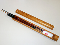 メダカ釣り用に準備した和竿の一本で、制作者の東京都伝統工芸士の吉田氏は竿ケースは作らないそうです。 無理に頼むと、廃材のエンビ管をオマケしてくれました。 そこで、京都の木工工芸士の所でサイズの合う線香入れを探しに行くと、ちょうど良いのは箸入れでした。 松材にしたので、梅柄の中敷きを入れると竹竿とで松竹梅の完成!縁起が良さそうです。 |