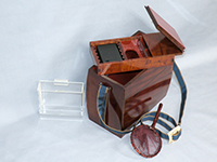 メダカ釣り用の活し箱で撮影用の観察ケースが収納出来きて魚の投入口は蓋があるタイプのコンパクトな物が届きました。 超小型エアーポンプが仕掛け巻き入れ部に収まります。 以前に東作7代目の松本氏にこういう物を探していると相談したのを覚えてもらっていて、作ったと電話営業が有りました。 東作は、江戸和竿の元祖で印籠継は初代の発案だそうです。 |