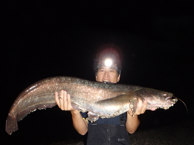 クラブメイトのY君のお誘いで現地で待ち合わせし、今シーズン2度目のビワコオオナマズ狙いに行ってきました。 大雨の後で水位はかなり上昇していました。 夜半過ぎの気圧の下がる時間帯に112cmを1本と、明け方にもメーターオーバーのビワコオオナマズをゲット。 |