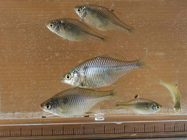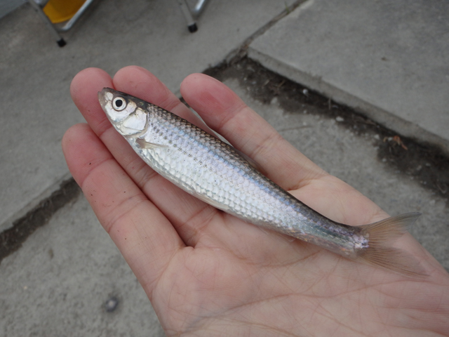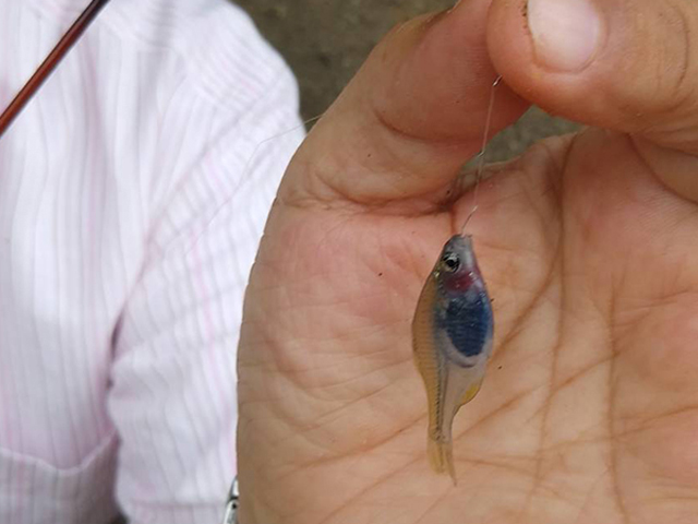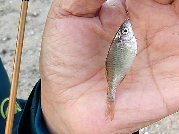 40匹くらい釣ったタイリクバラタナゴの中に透明鱗がいました。 19mmのメダカも釣りました。 |