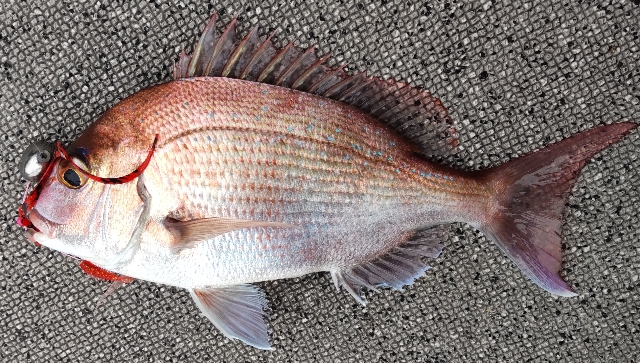 12月の一番寒い日。序盤から指先の感覚はゼロに。 地獄針のおかげでなんとかキャッチできました。 極寒の最中に釣れた鯛は感動もの。 |