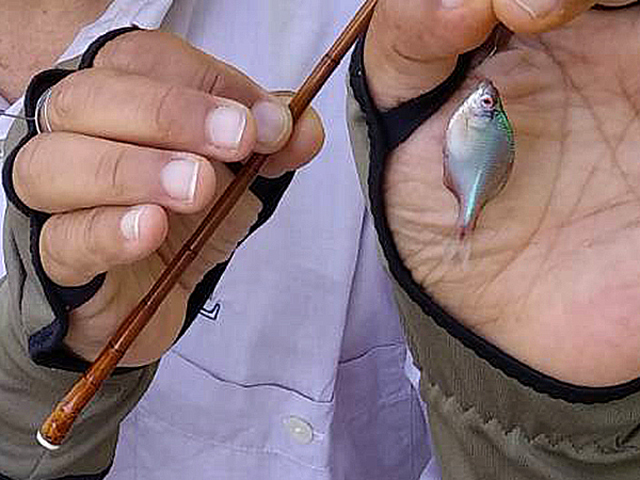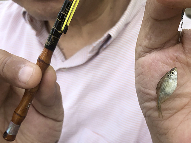 浅井 啓司 和竿:手書きの東 タナゴ竿 2尺1寸根竹鯨穂 8本継 道糸:PE0.06 鈎:0.1mmステンレス自作 餌:グルテン+添加物 |