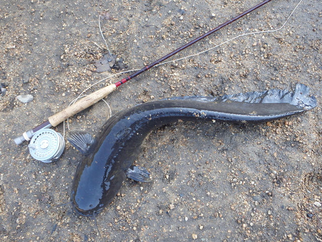 大雨の後の夜半、気圧の下がるのを見計らってウェーディング。 明け方までになんとか2本ゲット。 |