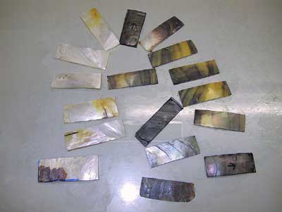 | 2.貝の光の良い所をダイヤモンドカッターでカットしてフラットな板にする |