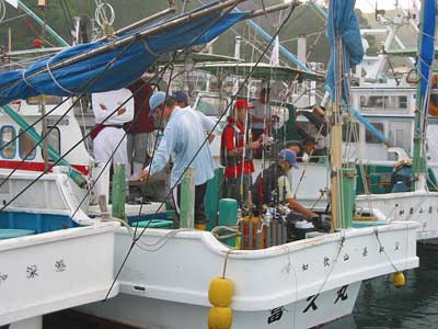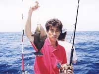それからもキャスティング、ジギングと次から次へと移動を繰り返しましたが、海からの答えは帰って来ませんでした。(即死状態) そうこうしている間に、時計の針は、もう11時をまわっていました。皆、諦めのムードの中、最後の1時間はオオクラ沖が一番魚の活性が高いと判断し、ラストの1時間はここで粘る事になりました。 オオクラ沖は引き潮がキツイ為か、波が逆立っていて足を踏ん張っていなければ立っているのも大変でした。 そんな状況の中でクラブ代表の松浦さんが、ジグで大型のツマジロモンガラをGETしました。 これを見て、思考を変え、皆がシイラ狙いのキャスティングの中、最近足摺岬沖でブリを3連発した桜花ジグ300gを根の荒い底まで落し込みました。 そして、20m程ジャークしてくると遂にヒットしました。マグロ・カツオ類独特のビリビリした手応えで上がって来たのは、キメジ(キハダマグロの若魚)でした。 それからまもなく、ストップフィッシングになってしまい、残念ながら船中では、この1匹だけがエントリーできる唯一の魚になってしまいました。