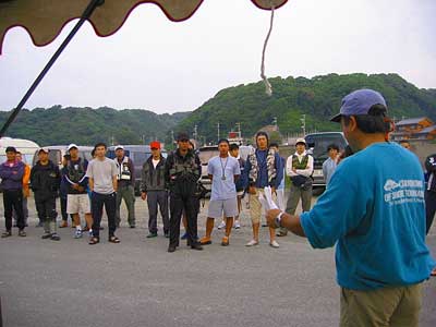 AM5時30分、大会の開催宣言とルール説明が行われ、大会実行委員長でクラブメイトの宇井晋介氏によるミーティングと続きました。 前日のプラクティスの釣果ではシイラは沢山岬前にいて、メジロ・キハダマグロなど大型青物も数多くヒットしたとの話しでした。 こういうワクワクする様な話しを聞かされると、釣りを始める前から、参加者全員気合が入ります。 トーナメントは出船前のこの緊張感がたまりません。